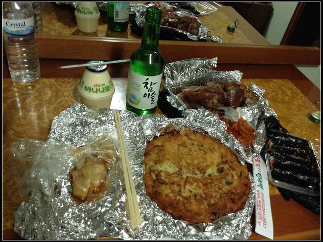 而同学却赞许有加,“挺好的,乱是活着的生动!”她还关心我在东大门这如此接地气的地方有没有消费,当然要花钱啰,转来转去挑了一盒紫菜包饭和一张饼,斩了一个猪蹄,烧酒自然是少不了的,无酒不欢嘛。在为韩国的鸡滴P做出小小贡献之后,自己的生活水平也突然大幅度提高。虽然居无竹,但达到了食有肉的境界!