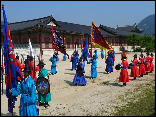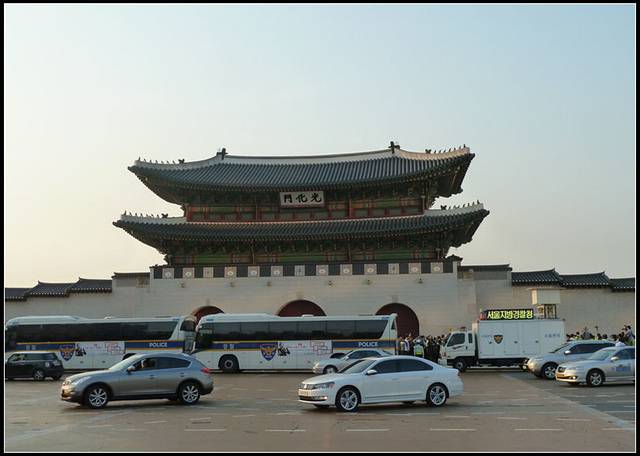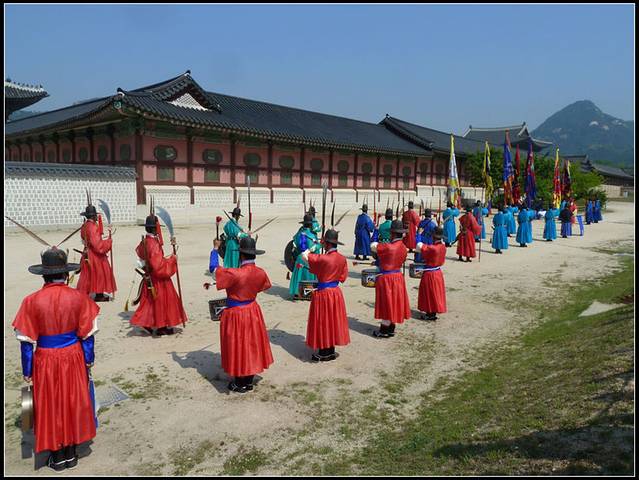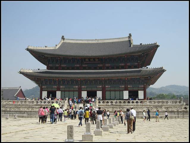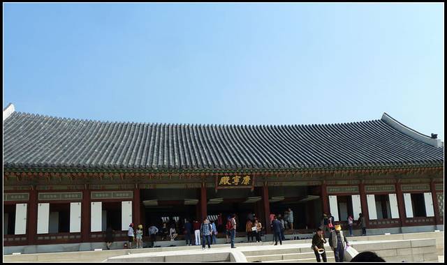 景福宫的规模为五大宫殿(景福宫、庆熙宫、德寿宫、昌庆宫、昌德宫)之首,网上的介绍是“景福宫是朝鲜(1392~1910)建国初期建造的第一座宫殿,迄今已有600年的历史。这是曾经风光无限的王宫,如今呈现给世人它那精小的质感美。”“精小的质美感”这几个字真是入木三分地刻画了景福宫的规模,我同事就没有这么含蓄了,干而脆之说景福宫恰似故宫的门房,传达室。