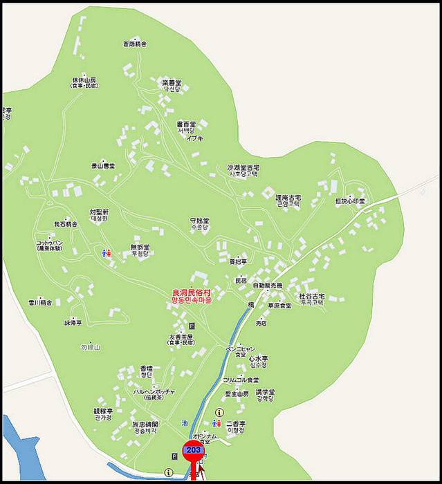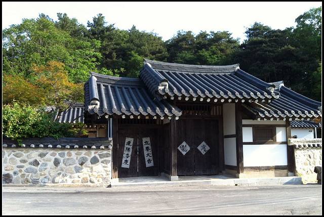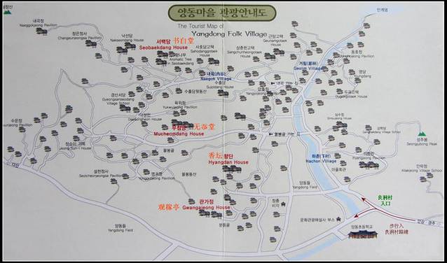 到了村口,司机与守门的人呜哩哇啦说了一通,好像是问能否把车子开进村去,没获同意。停车后我们三人向村里走去,司机去售票亭替我们买票,4000韩元一人,在我试探性的询问后,给我免了票。又去旅游咨询亭拿了份良洞旅游图,可惜是韩文英文对照的。