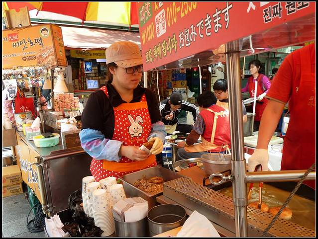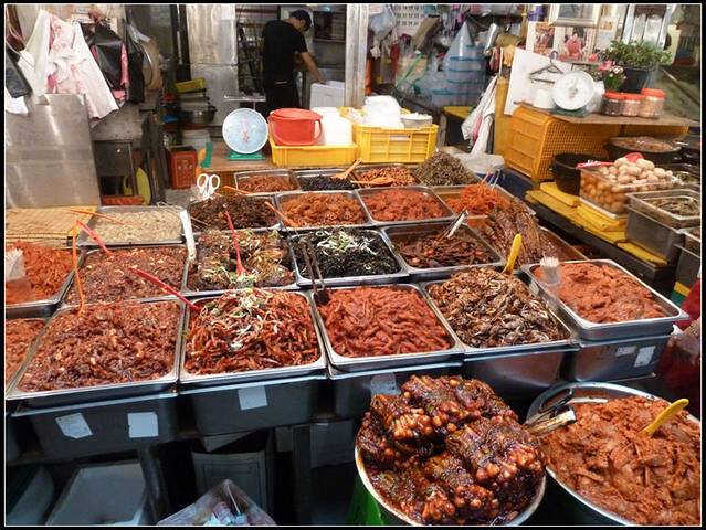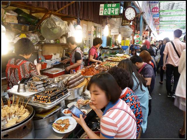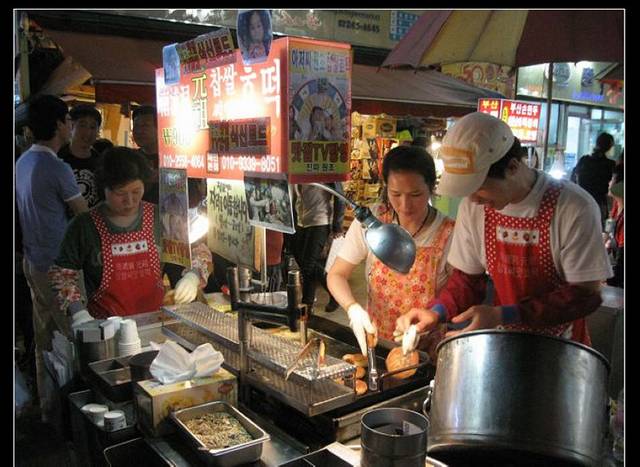 而在市场中心地带,聚集了经营各种韩式小吃的摊位,品种都差不多,什么炒年糕啊、紫菜包饭啊等等。更多的是油炸食物,摊主当着食客的面煎又煎又炸,呛人的油烟绕梁一日复一日,永远散不掉。食客与忙碌的摊主相对而坐,抿一口小酒,津津有味地佐以小吃。