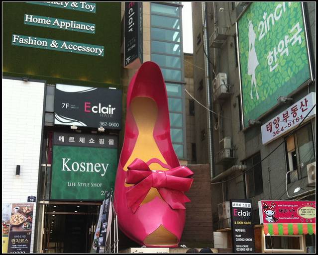 梨大正门所在的一条街道就是著名的“梨大女人街”,以硕大的粉红高跟鞋为标志。