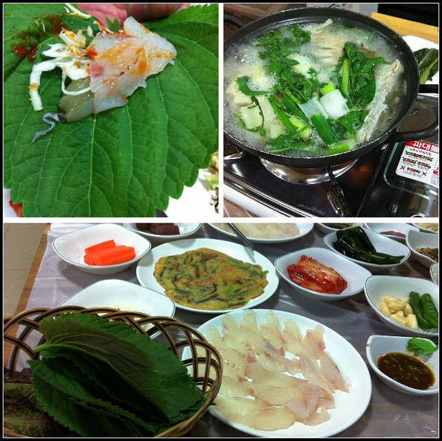 我们径直上到二楼,这里是传统的榻榻米食肆,不习惯盘腿,要了张桌子,上生鱼片!韩国吃饭有点麻烦,如果是一位,店家会不接待,估计一个人也要上那么多碟子盘子,店家觉得太亏了。我本想只点一份,不可以,必须一人一份,花去大洋3万。当用紫苏叶包着薄薄的鱼片一口一个塞进口中,想起第一集《舌尖上的中国》的台词,“今天当我们有权远离自然,享受美食的时候,最应该感谢的是这些通过劳动和智慧成就了餐桌美味的人们。”