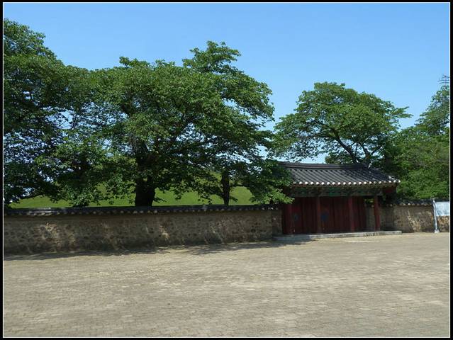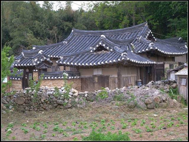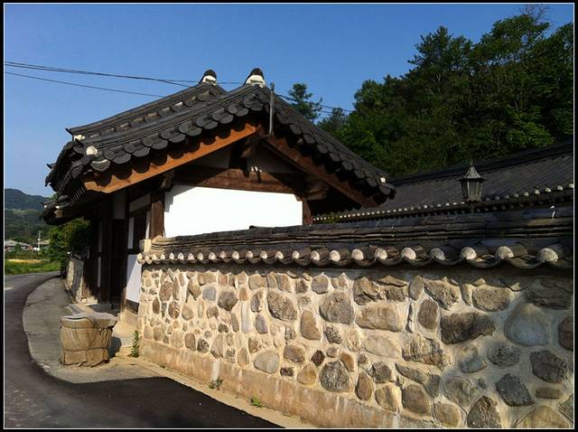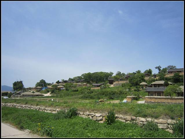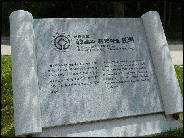 司机领着我们往里走,天很热,我让司机回到车上等,不知是职业的要求还是听不懂我那不地道的英语,司机执意走在前面。到了树荫下,司机停住脚步,要我们stop。我很奇怪,但因为交流太困难只好照办。等了一会儿,过来一个女子,原来司机主动为我们约了解说员。她问我能听懂英语吗,我说little,我又问她能说中文吗,她回sorry。然后她很起劲地介绍起良洞民俗村来。幸好我事先对良洞的背景知识做过了解,多少能听懂一些,但她的发音实在太怪,我还兼有为我爱人翻译的任务,很快就感到力不从心,急得后背全是汗。趁解说员喘气的当口,也不管是否礼貌,我不失时机接过话头,直接说,我们想自己对着旅游图随意走走看看。解说员脸上立刻现出如释重负的神情,司机在热心地给我们照了几张合影后也转身离去,留下获得解脱的我们。