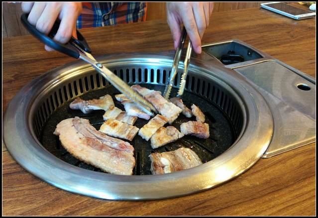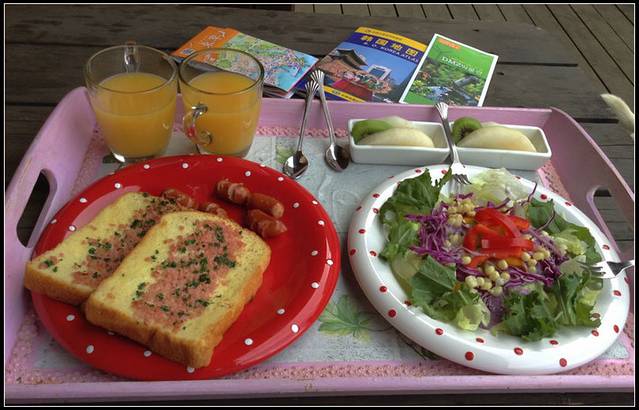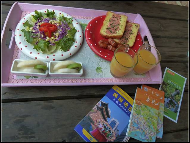 咖啡、面包片,一双鸡蛋,几片梨齐齐地码在碟子中。尽管谈韩餐色变,我还是为这顿准西餐惋惜,要是把咖啡换成大酱汤就和这环境完全贴合了。