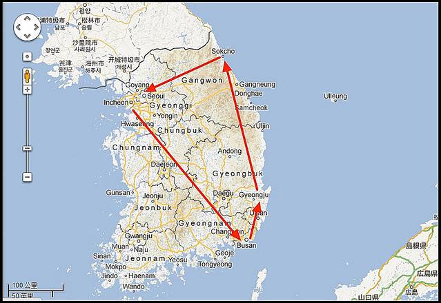 韩国有什么可去的?血拼购物?追逐韩星?品尝美食?这些都不是我的兴趣所在。点开攻略,韩国的主题词竟然是“泡菜”! 其中购物美食的攻略又比旅行游玩的攻略多,而且旅行的地点集中在首尔釜山济州岛,甚至只是首尔一游,真让人提不起劲来。但不管怎么说,有地方可玩总比宅在家里强,在不情不愿之中,我还是一如既往地开始了前期的准备,于是,就有了一个前后共13天的行程:南京--仁川Inchone--首尔Seoul --釜山Busan--庆州Gyeongju --束草Sokcho --高城Goseong --春川Chuncheon --首尔Seoul,逆时针环韩国半圈。