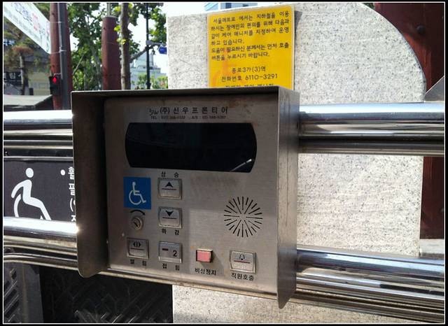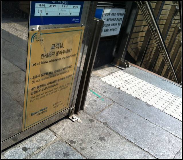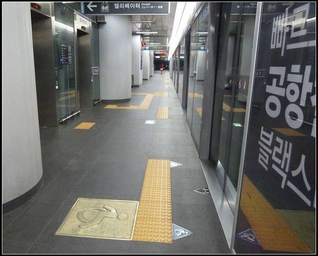 韩国,但凡建有地铁的城市,不用东张西望,在你认为最方便的地方总是如你所愿竖立着一部直立电梯,旁边是明显的轮椅标示,而有轮椅座的那节车厢会准准地停在这个位置。唯一要做的就是把轮椅推到专座上。