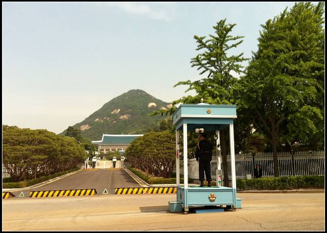青瓦台参观台上更是人满为患,一片肆无忌惮的嘻嘻哈哈声。中国游客的固定pose是站在栏杆前,右手张开两指做V字状。一个接一个,你方唱罢我登场。这样的环境下,工作日朴小姐还能安心办公吗?