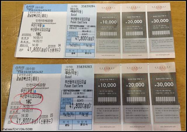 从仁川机场坐机场快线到首尔站,1小时左右,在首尔站买票,再乘坐高速火车到釜山,2个半小时。但我们考虑到初来韩国,想慢慢欣赏沿途风景,决定还是乘直达釜山的长途大巴,虽然大约5个小时左右,但就在机场10C出口外上车,免去了转乘之烦。而且事先我在网上查过,大巴的经济座票价41800韩元一人,火车的经济座52900韩元一人,综合权衡后还是去买了大巴票。可惜大巴是两小时一班,我们去买票时是12点40分,上一班车才开走10分钟。一直在机场里等了将近两小时。