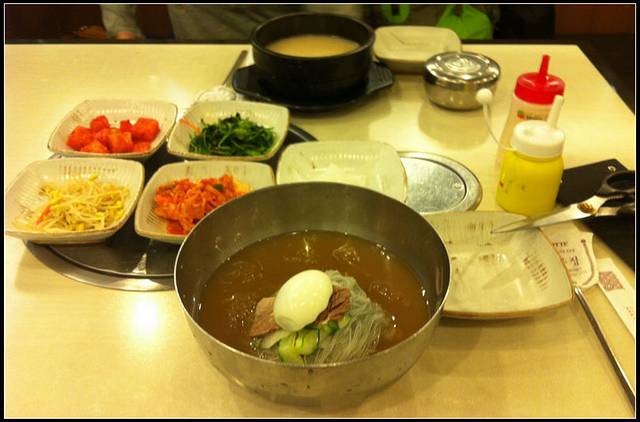 换乘站台找不到,偶心窃喜,没想到“万不得已”的时刻这就到了!从清凉里站出来,眼前一亮,乐天!不为化妆品不为时装,直奔七楼觅食。一份牛肉汤一份冷面,请快点上!