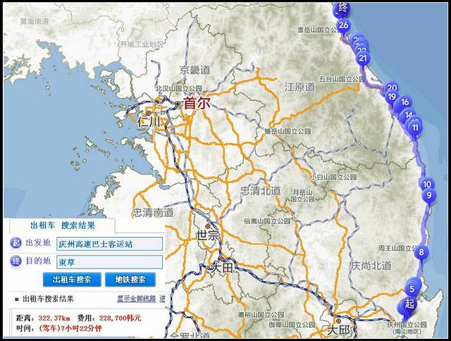 从仁川机场到釜山长途巴士站,440公里,两点半出发,沿途经过龟尾市、漆谷郡、大邱、7点左右在梁山堵车19分钟,7点半到达目的地。