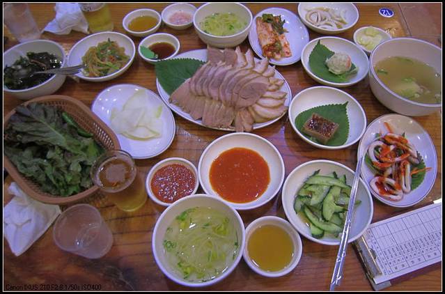 酒店周围一条一条的小街灯火通明。我们在猪蹄一条街找了一家店,挑了个小份,25000,加一瓶啤酒,3000。真夸张啊,先乒乒乓乓上来了19个碗碗碟碟,最后隆重登场的才是主角,中间那一大盘片好的猪蹄。虽然中午没吃饭,但对着这一大桌子还是感到力不从心。又不好浪费,费力地把猪蹄吃得差不多了,起身结账,忽然想起身上只揣了17000块!刚到韩国,对于韩元还没有什么概念,心想17000元吃顿饭肯定够了,也没有把信用卡带出来。只好又坐回桌子自当人质,让我爱人回酒店取钱。