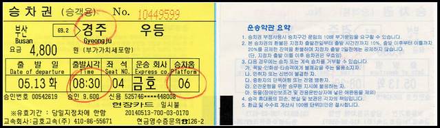 从釜山到庆州可以坐火车当然也可以乘大巴。在家里我分别测试了这两种交通方式,还是大巴方便快捷而且更重要的是,省钱。