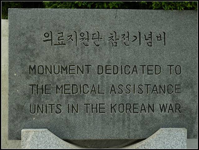 出了公园,就在右手边,有一座碑,上面刻着:“Monument dedicated to the medical assistance units in the Korean War.”