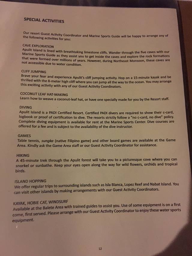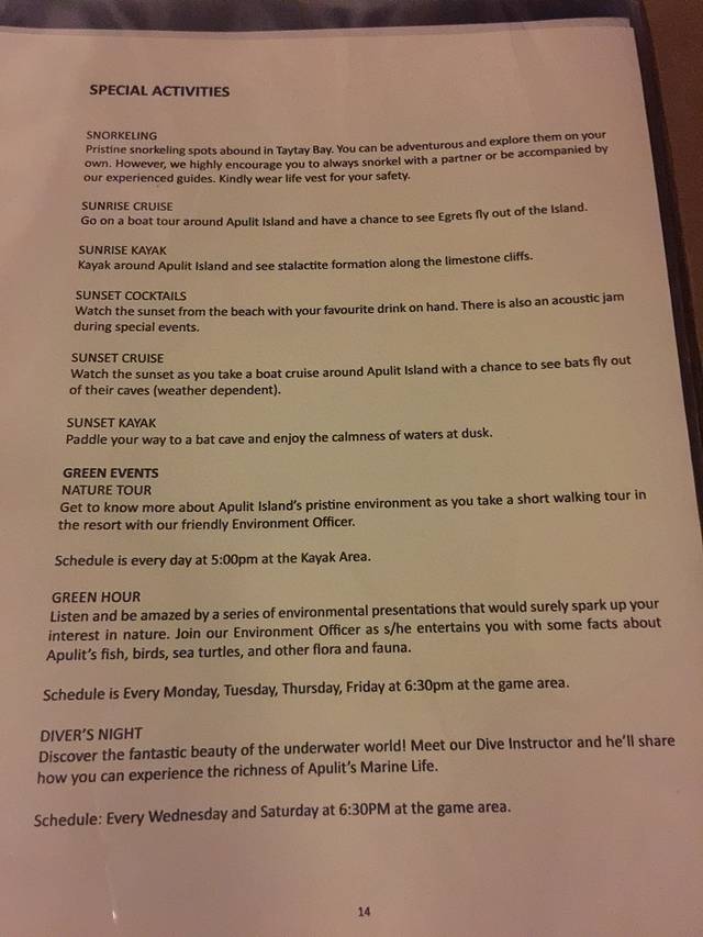2.菲律宾几乎全民都会说英语,只是口音有点重,其中爱妮岛的工作人员英语普遍比公主港碰到的人要标准。不过那些十万火急、真正需要沟通的时候,再奇葩的口音你的潜能也会爆发让你悉数听懂的,不用担心。