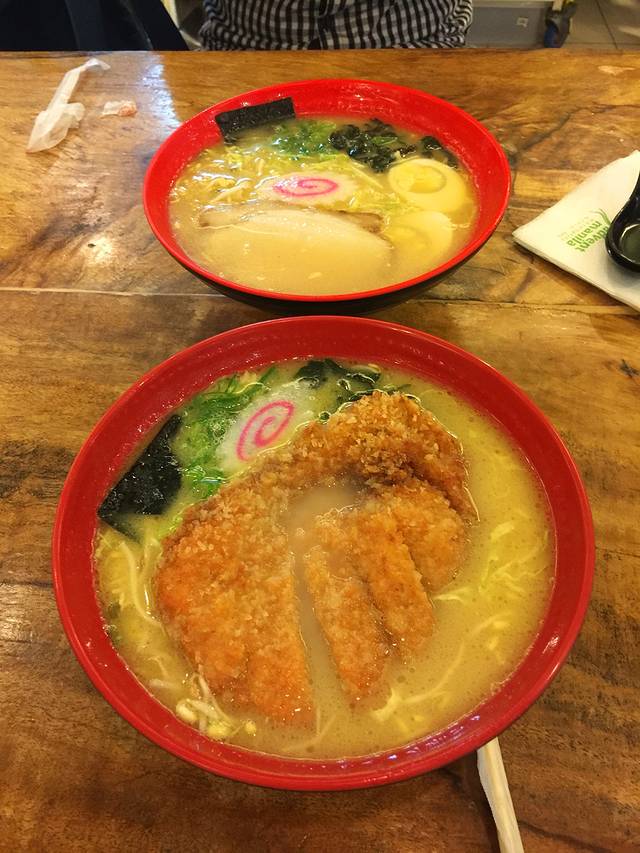 拉面端上来的时候,看到厨师把香脆的猪排直接扔在了面汤里