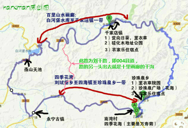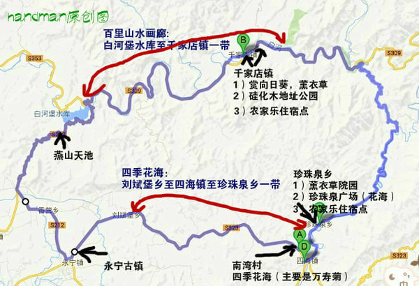 线路推荐2:如果直接去四海镇赏花,也可以考虑这样的路线:从北京出发走八达岭高速,昌平西关出,沿S212前行,过十三陵水库后在丁字路口处向右转,沿S308怀长路进山,直至九渡河与S213安四路交汇处转入2213后继续前行,一直开到四海镇一号漫水桥,在加油站向右转去珍珠泉,向左转去四季花海景区。