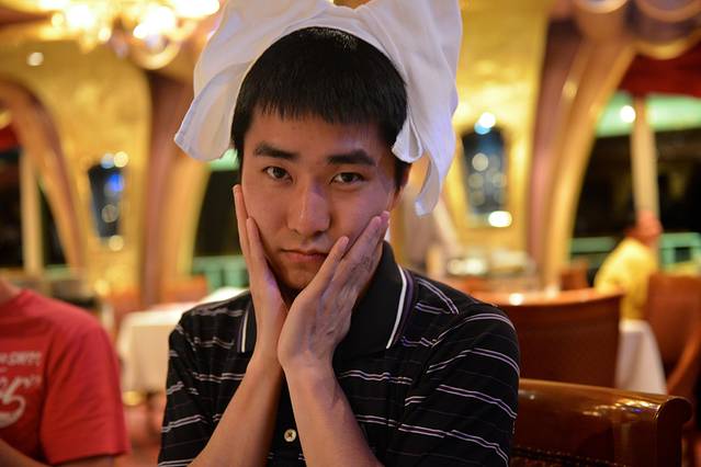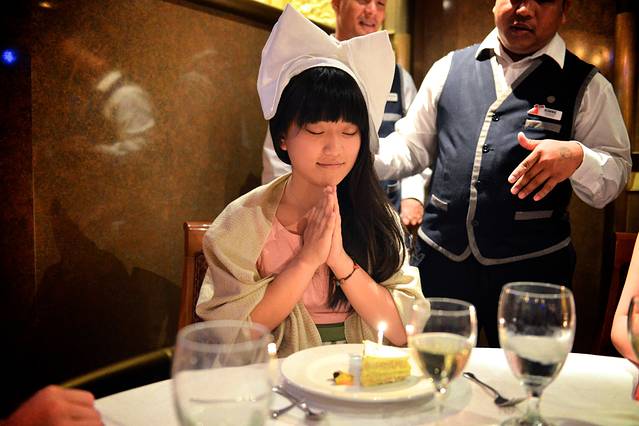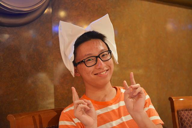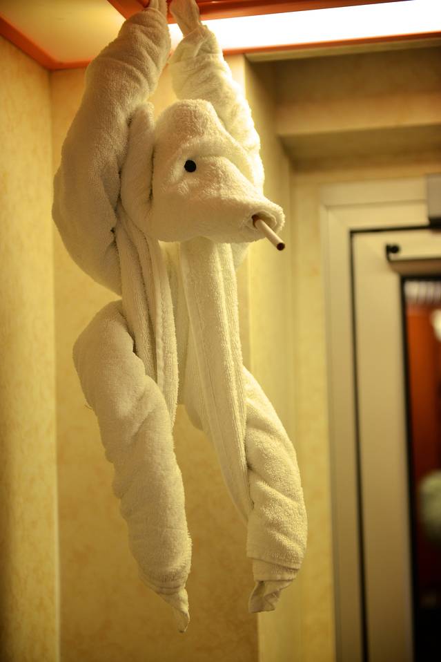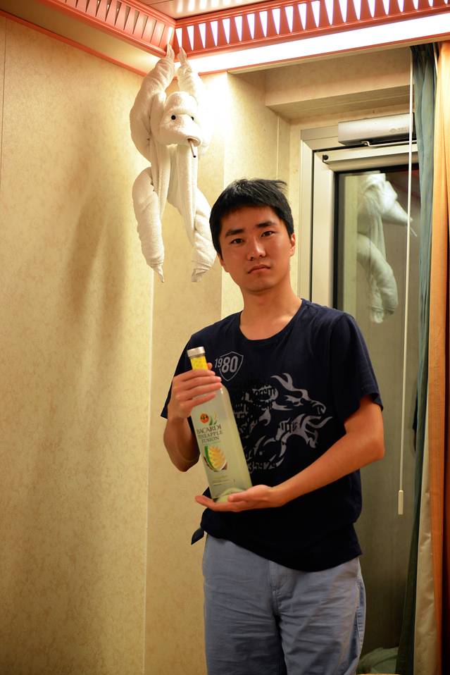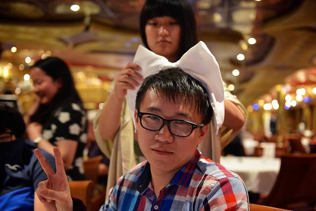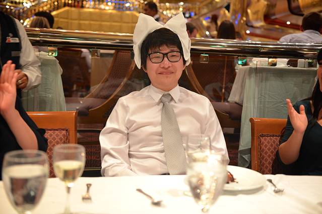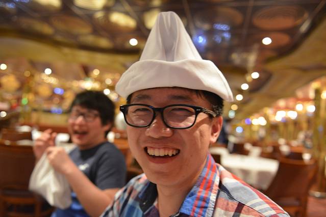 回到到船上,又有一个人今天过生日,依然是游轮特色,手帕变成帽子