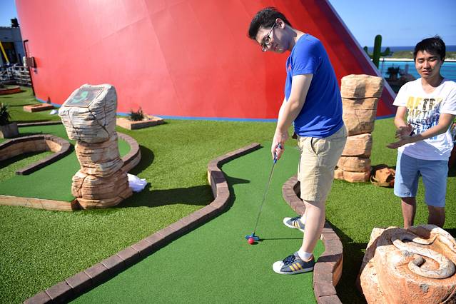 回到船上,离开船的时间还有一会儿,正好甲板层有个高尔夫人造果岭,正好玩一玩。遥想当年,哥一手高杆绝技冠绝南京高中生界~