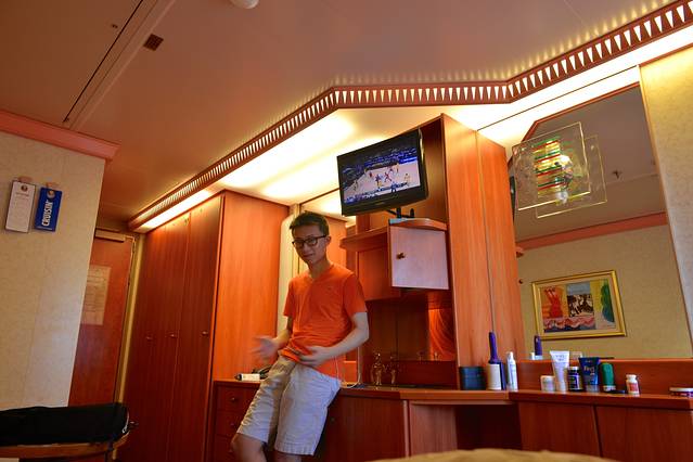 一般来说房间分为四种,内舱房、海景房、阳台房、套房。顾名思义内舱房就是没有窗户,完全封闭的房间,在房间只能休息其他什么也干不了~海景房就是内舱房多了一个窗户~阳台房比海景房多了一个阳台,阳台不大,一般能放两个躺椅差不多了~套房抱歉,土豪的标配啊~我们一共10个人,其中四个男的住在一间,所以订的是阳台房~事实证明阳台房还是很有必要的,有时候坐在阳台吹吹风也是很好的,最终是别人睡下午觉你没地方呆,你可以呆阳台吼吼~一般来说船有11-12层 12层是甲板层~内舱房和海景房都在最下面~阳台房和套房比较偏上~