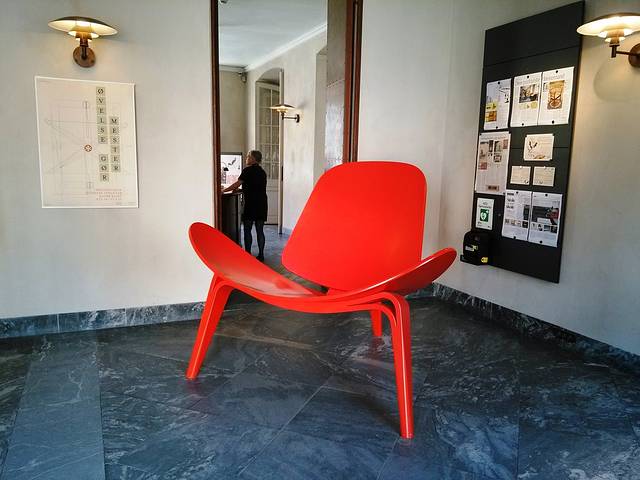 门口就有一把鲜红的大椅子,在北欧工业设计中,椅子和灯具是精华所在。因为在秋冬北欧人有非常长的时间是呆在室内,所以对室内设计和家具设计非常重视。