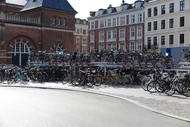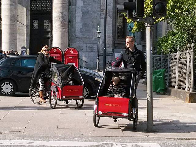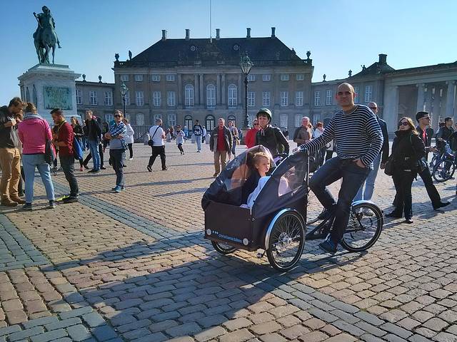 自行车在北欧非常普及,尤其是丹麦,540万的人口,有420万辆自行车,人均拥有量为0.83辆,而中国的人均拥有量才0.32辆。在丹麦全国,有数千公里的自行车道,甚至还有自行车专用高架。更有意思的是,丹麦的自行车款式相当的多种多样,有“倒骑驴”式、后拖尾式,还有可以同时运载2、3个孩子的“家庭式”。