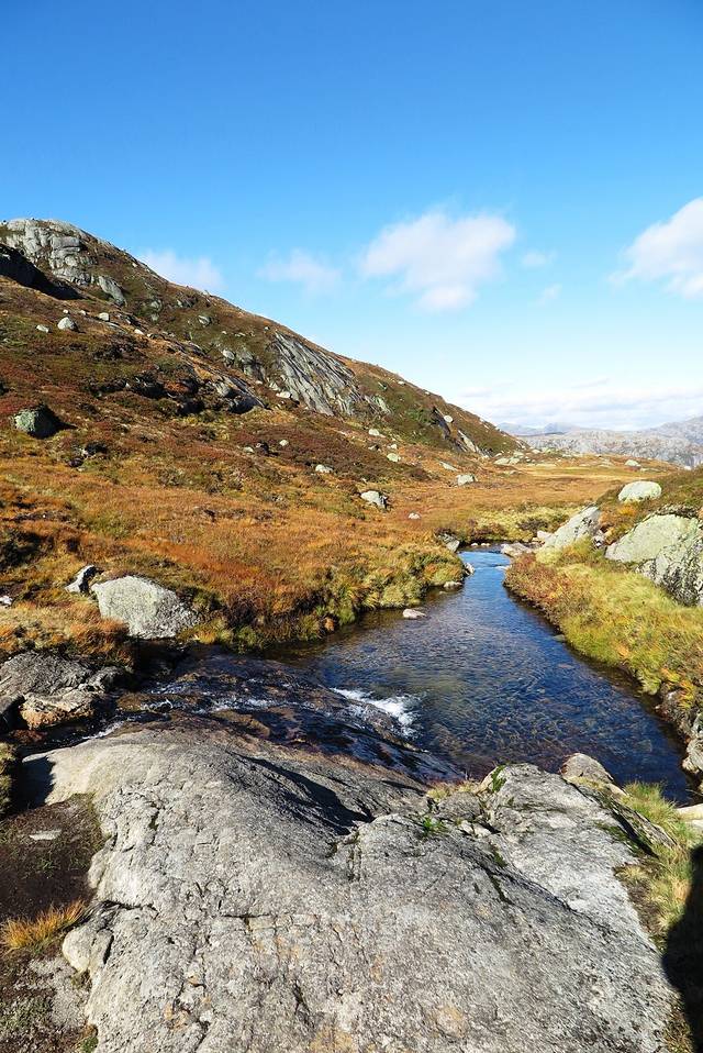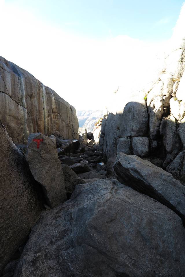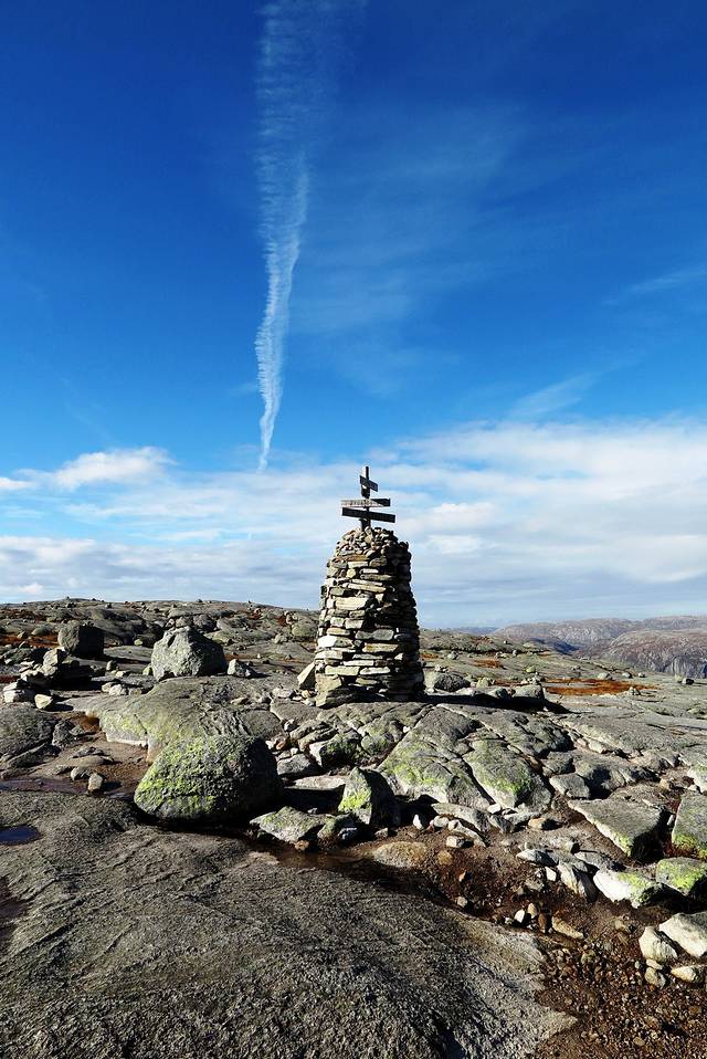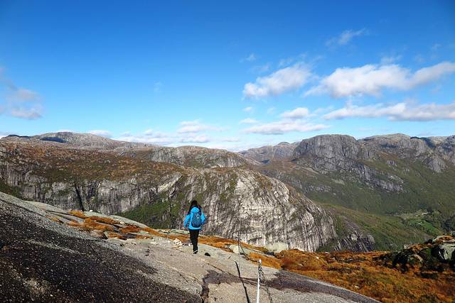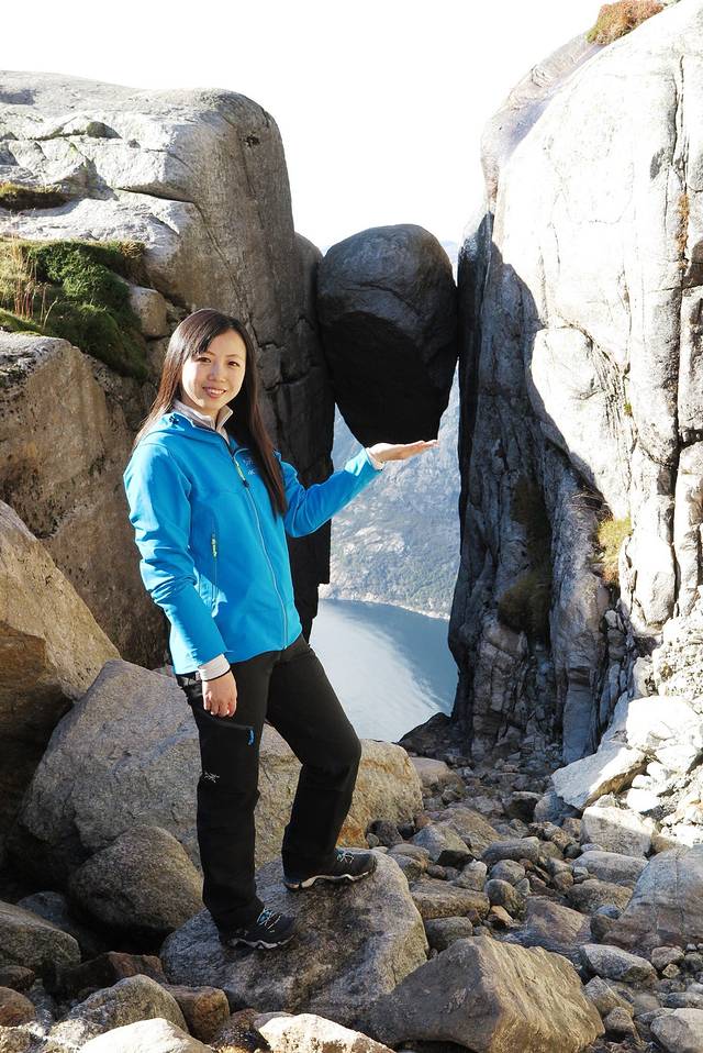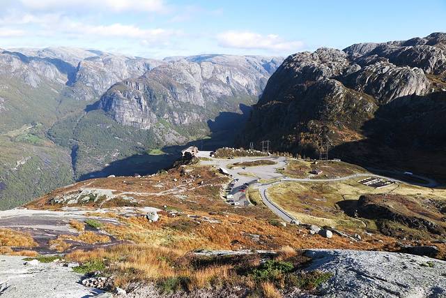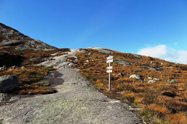 行走在地狱 视觉在天堂--奇迹石(Kjeragbolten)奇迹石是这次旅途中最期待的一个景点,座落于挪威谢拉格山的山顶之上,有一块5立方米大的石头卡在绝壁间,距离谷底大约1000米,是自然界十大最不可思议的平衡岩。从斯塔万格自驾去奇迹石山脚下的停车场有两种方式:一是开到劳维克(Lauvvik)然后坐吕瑟峡湾的船去到吕瑟伯顿(Lysebotn),再开车到达;还有一种是全部走陆路,从E39转Rv45,再到Fv975、Fv986,最后Fv500到达。前者省时间但那班船是需要提前预定的,而且据说9月底后班次就很少了,后者路绕的挺多但是沿途风景还不错。