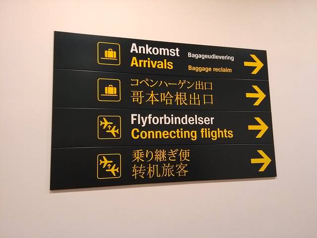 安全抵达哥本哈根机场,起飞晚了将近1小时,最后晚点了20分钟左右,长途飞机20分钟应该也不能算晚点吧。一出机场就能看到中文标识