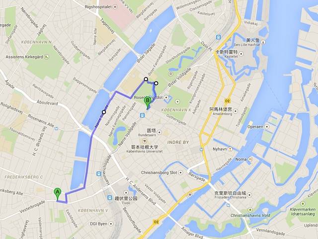 步行线路图:从A处酒店-五大湖(这名字是我自己起的)-哥本哈根大学植物园-B处公交车站坐6A路回酒店(约5km)