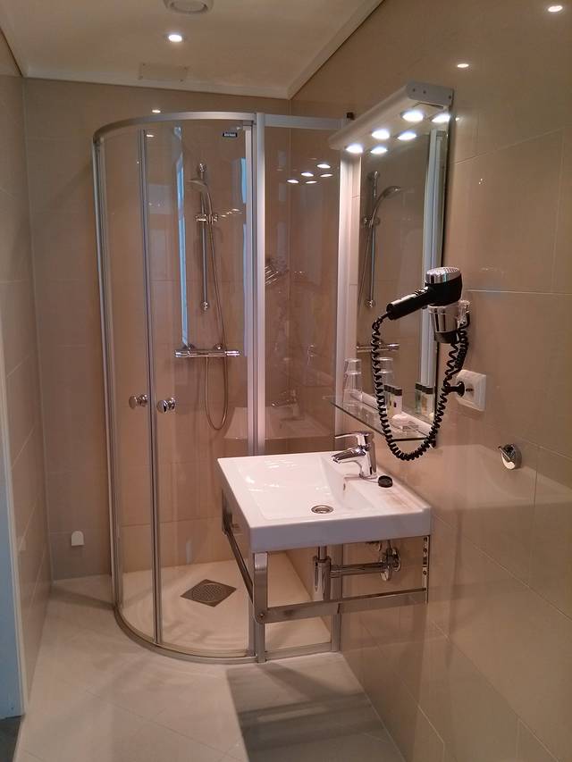 我们选的是海景双人房,其实也是4张床,有独立卫浴,房费114欧,加上自助早餐和各种手续税,totally是159欧,比火车/大巴+住宿费还是便宜不少的。房间真的很小,箱子打开就没地方走路了,不知道4个人怎么住法。