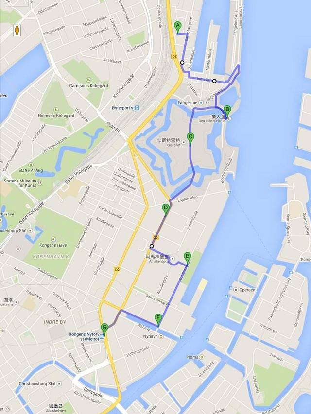和第一天刚到哥本哈根闲逛不同,今天是哥哈著名景点一日游。路线:酒店(A)-小美人鱼(B)-卡斯特雷特城堡(C)-丹麦设计博物馆(D)-腓特列教堂-阿美琳堡王宫(E)-新港(F)-救世主教堂(G处坐地铁前往)-哥本哈根大学