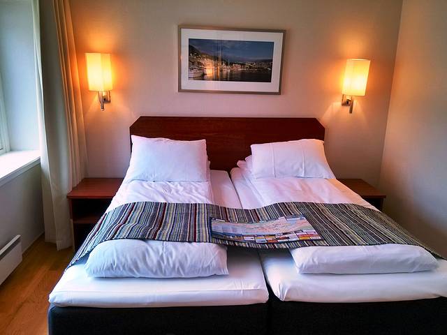 在北欧住宿也是预算的大头,看得上眼的标间价格几乎都在1000元左右,我们这次定的都是3-4星级的酒店,基本上都在这个价钱以上,最贵的一晚要1300元。但也有便宜的青年旅馆或Guesthouse,不过设施就差一些,有些是上下铺的,公共卫生间的,一般500元左右。(Ps:我们去的时候,挪威克朗和人民币基本是1:1,所以我就不写单位了哈~~~)自驾的朋友还可以选择camping,挪威营地非常多,公路上都有很清晰的营地标识,营地大都提供木屋,房间出租。一个两人木屋大概也就500元左右,不过人气很旺,要提早预定。另外,北欧酒店都没有拖鞋、木梳和一次性牙刷牙膏,要自带。电热水壶基本都有,没有的话,酒店大堂也会提供免费的热水服务。青旅和camping设施不清楚。