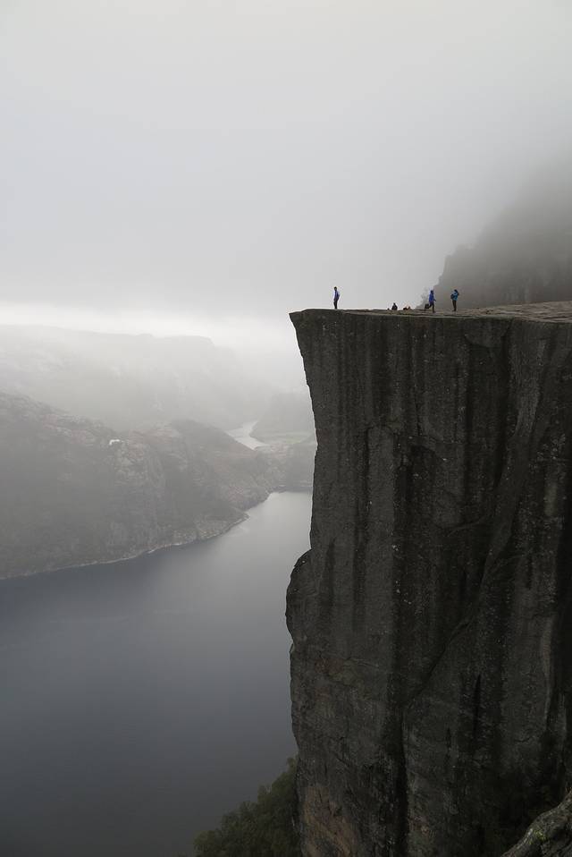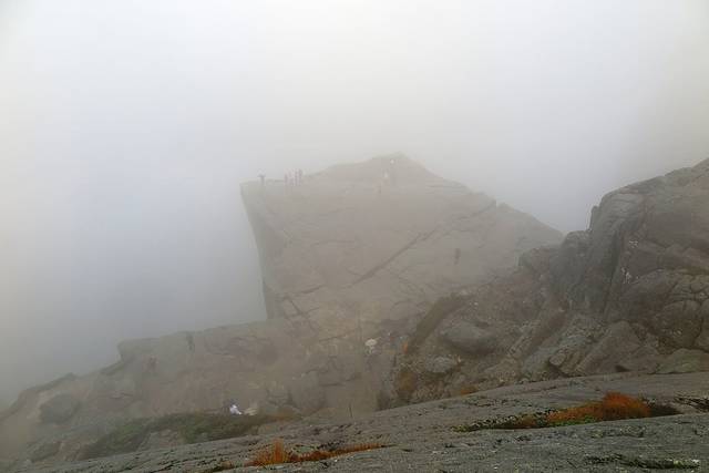 是差不多走了2个小时后到了布道石。从斯塔万格出发坐渡轮时,天气非常好,晴空万里。做攻略的时候,看到说9月份布道石天气好的几率不高,经常会起雾,我还在窃喜自己RP真高。但事实证明,我的RP还没积攒够,在到达停车场的时候,天就阴了,快要爬到顶的时候,开始下起了小雨。整个布道石都在雾中,别说看不到峡湾,就是人站上去都不是很明显。