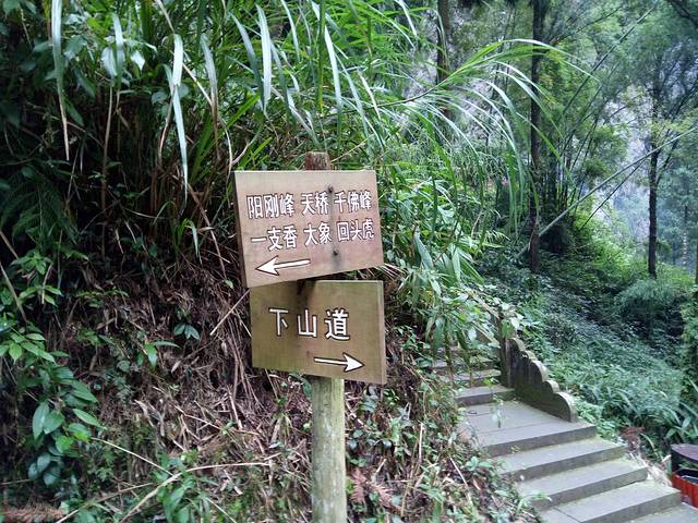那个铁索桥真是很霸气啊。过了桥到了个亭子,再过去到了所谓的景天湖,其实就是个小水塘,水塘旁边有个佛学书店。关键是走到这里有个碑“回头是岸”,没路了。