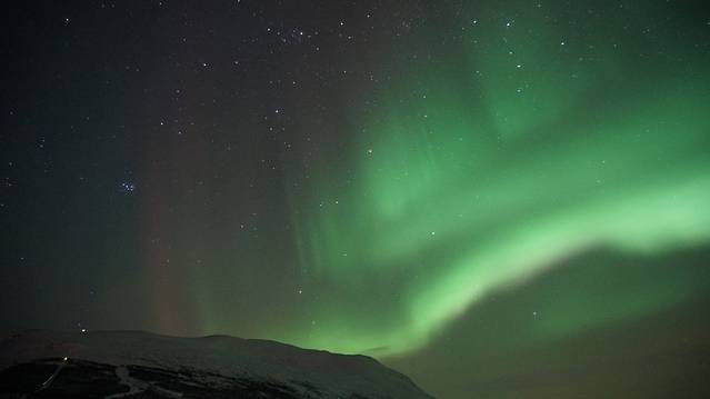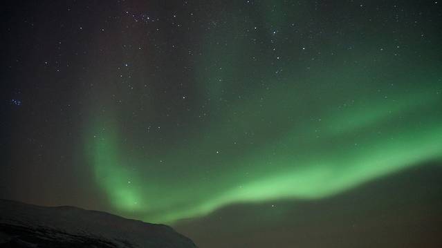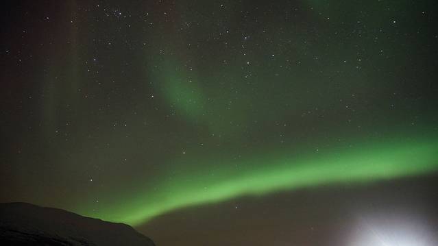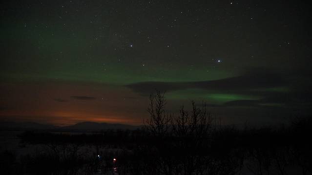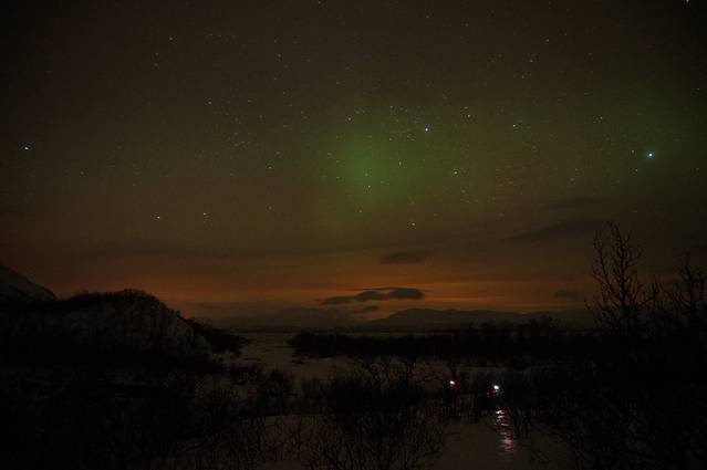 在结束活动正要回程的时候,大巴停着等一些人去洗手间还没回来。司机指指窗外很淡然的说一句,那边有极光。一群小伙伴赶快冲下车。我们看到支三脚架的支三脚架,摆pose的摆pose,没带三脚架的我只好尽量控制机身不动,后来干脆躺倒在了路上把相机放在随身小包上拍。和之后的爆发比这次只是小打小闹而已,不过对于第一次看到极光的我们,兴奋之情可想而知。后来看过爆发以后青旅里有朋友偶尔来一句现在还有极光呢,我们也变得很淡然的回了句,刚才看过了,哈哈。这几张拍的极光,由于有前景的小木屋,就是记忆里北欧极光的感觉,当时用肉眼也能看到一点绿色了,所以也不是太弱的极光,听同团的一些人说有的人只能看到像雾气又像云一样的白色,要用相机曝光很久才有一点绿,我们也实在是好运气啊。