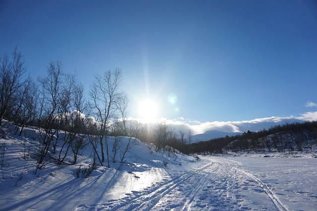 让正好来玩的家人从国内带了暖宝宝(事实上并没有怎么用到,足贴可以备着暖暖脚)和三脚架(很悲催的忘记装上了),行李越少越好,我就背了一个大书包,一件外套穿到底,一双鞋子走到底,帽子厚围巾厚手套也不可少。二月份北欧的天气还是很冷的,特别是在雪地hiking要一双保暖的靴子,防滑最好,不然的话可以买那种套在鞋子上的鞋套,前半脚掌大小,接触地面的那面是钉子,特别好用,在abisko的青旅超市买的,这次帮上了大忙。雪地其实不滑,融雪和冰才滑,没有这种鞋套的滑最好一步一步踩深了走,不然摔倒会是家常便饭,在没有鞋套的第二天走的一步一顿的,风大的时候就更加了。