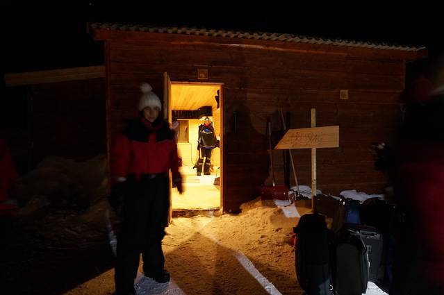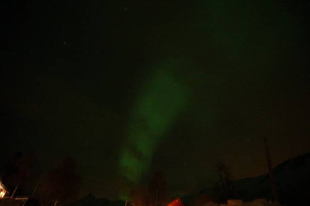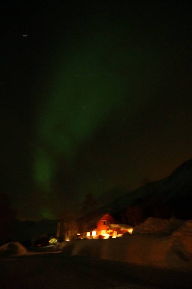 还在等位子的时候外边忽然有小骚动的声音,一小拨人抱着三脚架相机就冲到了餐厅的小阳台。我们里面最爱好摄影的小陈同学也跟了出去,一直到我们坐下等点菜了她还在依依不舍地摆弄相机,回来跟我们说看到了一小条极光,是白色的,长时间曝光能拍出绿色。懒惰的我们想着绿色的也看过了,就不去看白色的了,外边还冷。于是慢悠悠地享受了晚餐一直从七点多吃到九点。在陈同学地催促下终于打起精神往积雪很深的暗处走去,等待极光再次出现。