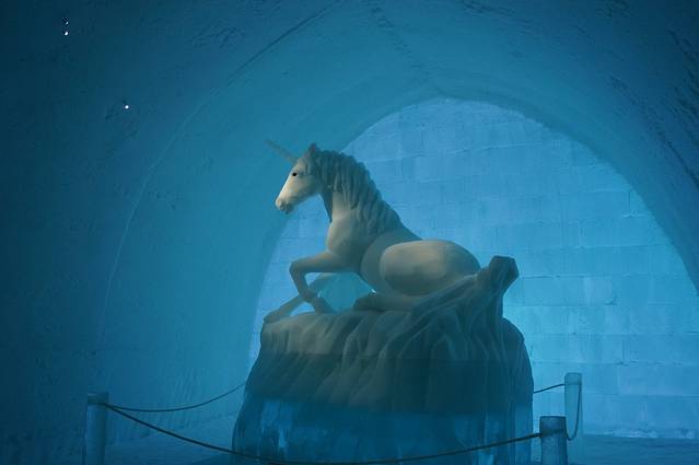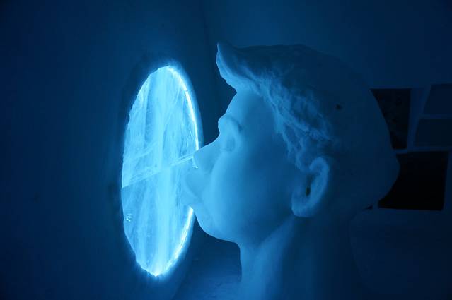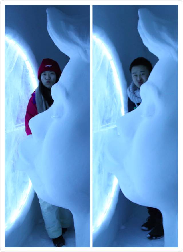 我没去过哈尔滨,不过想像冰雕节的那些作品应该并不比冰酒店逊色吧。主要就是一间间特色的有冰雕布置的房间,还有冰床,并且好多相对简陋的房间都是一个样子的(标准间,哈哈),真正能让你“哇”的并不多。而且冰室里面灯光很暗,照片也拍不好。
