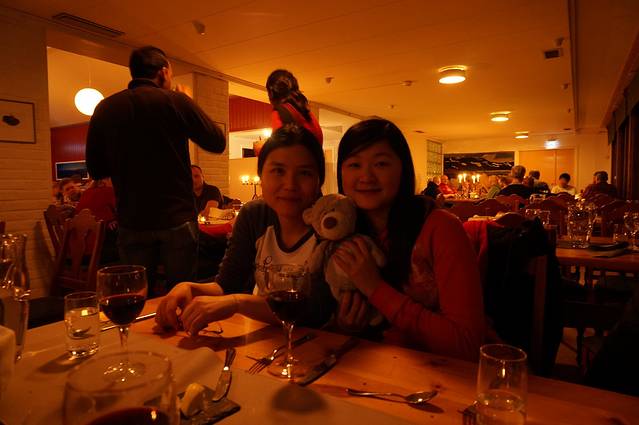 在checkin的时候和参加第二段加入我们的小马同学碰了头,一下午就窝在前台旁边的沙发上商量第二天要不要报团参加雪地活动。之后就去餐厅吃烛光晚餐了。