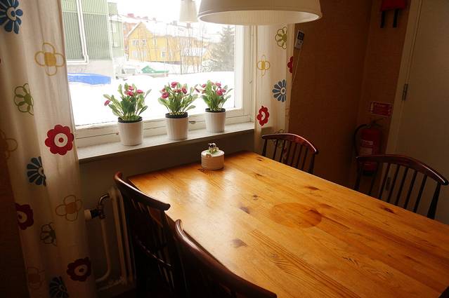这家在Kiruna的民宿,我们是一间五人间,公用厨房可以做饭,厕所冲凉公用。这家要说缺点就是女房东比较“直爽”,记得同去的女生洗好澡没有把冲澡隔开的那部分地面的水弄干,想着后面马上接上人洗了,女房东特意把她叫过去示范了一遍。。还有checkin的时候问我们要几套床上用品也比较生硬,好像生怕你多住一个人似的。(虽然是五人间其实可以睡下七八个人,但是是按人头收费的)除此以外还是一个很温馨的小地方,距离冰旅馆当然有距离,除非你住冰旅馆一般住的离那里都挺远的,其他如火车站巴士站,教堂,超市都能走着去。可路上就算一直有人铲雪,道路上积冰还是很容易滑的,自从abisko买了鞋套以后出门就一直套着,走起路来铿锵有声,也不怕摔了哈哈。我们晚上去超市采购自制了晚餐,我还把新买的烛台点上了,气氛不错。