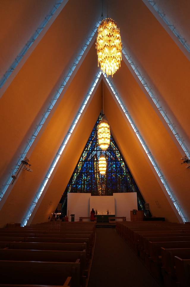 教堂是尖尖的三角形,彩绘玻璃也是三角的。