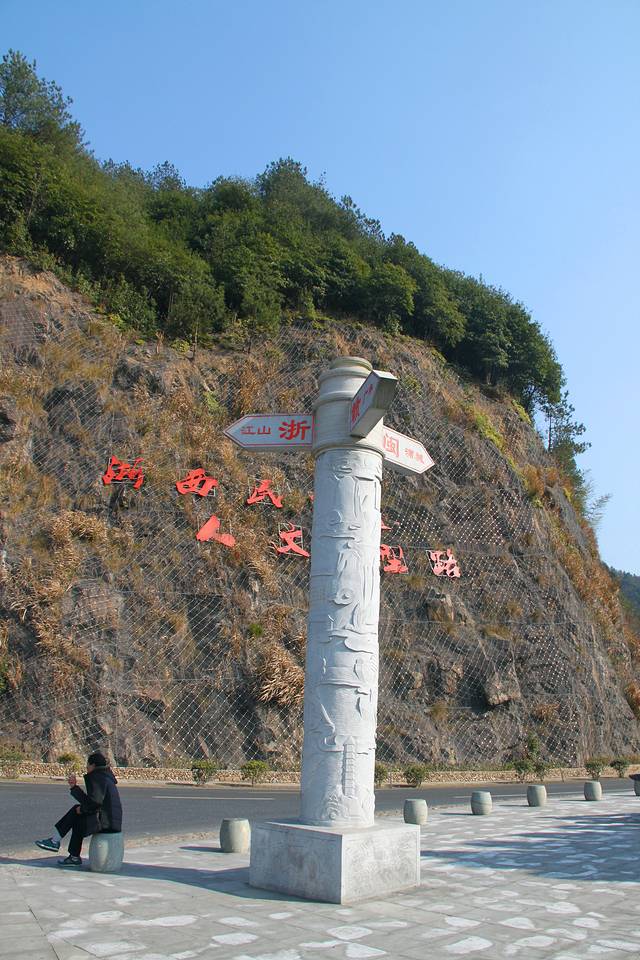 小车在山中七弯八拐,浙江江山市境内有个三省交界的“华表”, “华表”立在三条公路交汇点上,上面三个箭头分别指向江西广丰、福建浦城、浙江江山。