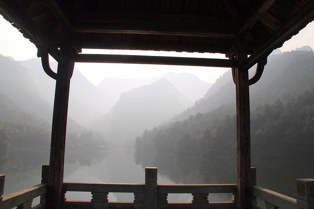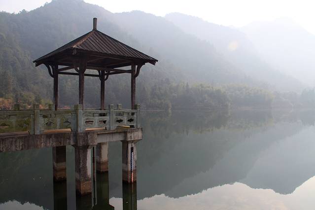 开车来到游客中心,这里并不卖票,凭高铁票乘观光车至半山腰再购票。老婆不想上山,于是穿过余家坞村来到江郎山的另一个景区大门:须女湖。