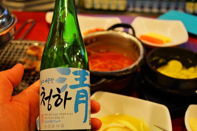 自带了一瓶清酒(是逛超市时买的KRW 1740)。颜色无甚出奇,香味若有若无,吃着烤肉,喝口小酒,那清酒的余香,从口鼻间缓缓弥漫开,很是难忘。
