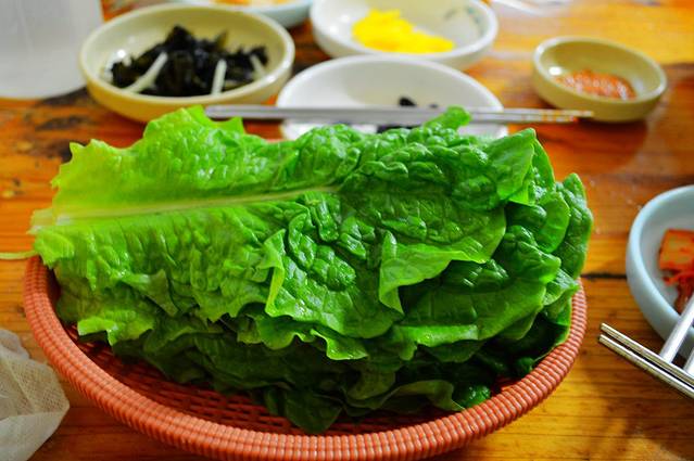 生菜叶(多数为芝麻叶)、泡菜、蒜头等不同配料,可自行搭配。