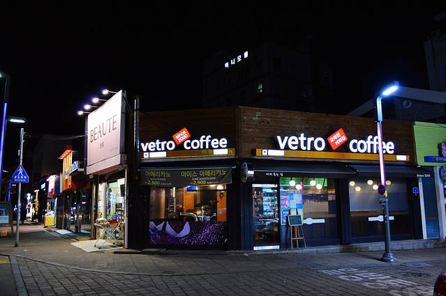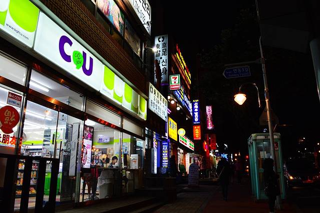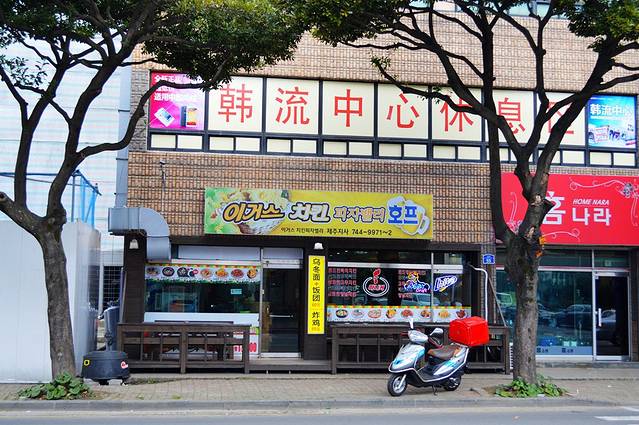 在济州岛旅行时发现,在有些小型的超市里会设计就餐的场地,在超市橱窗前依稀可见到简易餐桌。