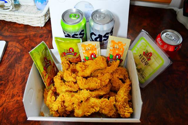 同伴晚饭没吃,自己跑到外面买了炸鸡啤酒,1850一罐的啤酒,17000的炸鸡,韩国时间已经00:20,开吃~