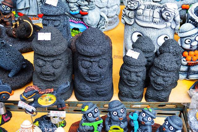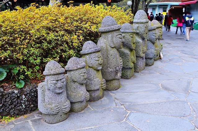 其中石头是指一种独特的黑灰色火山石。用它雕刻成的守护神被当地人亲切地叫作“石头爷爷”。石头爷爷大多是眼睛凸出、鼻子粗大、嘴唇紧闭的样子。传说左手在上的石头爷爷是武官,右手在上的石头爷爷是文官。摸摸石头爷爷的鼻子可以生儿子,摸摸石头爷爷的肚子和手则可以升官发财。据说韩国情侣结婚后,必定要到济州岛,拜石头爷爷,以求多子多福。石头爷爷的头很像男人的生殖器,最初创造石头爷爷的目的是一种生殖崇拜。