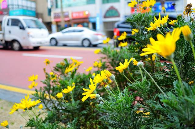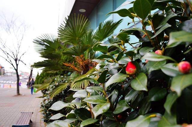 这张照片就是想说明二月初的济州街边有鲜花盛开。