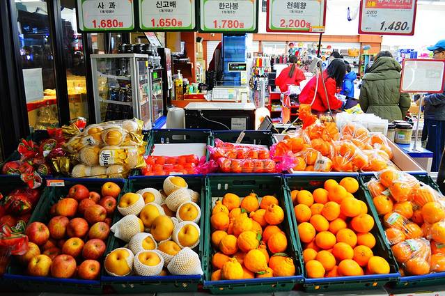 给大家介绍一下韩国超市里的水果,都是按个卖的,换算成人民币,依次的价格为:苹果10元一个,梨10元一个,丑桔10元一个,柑桔13元一个,桔子一小袋3个8元5角。