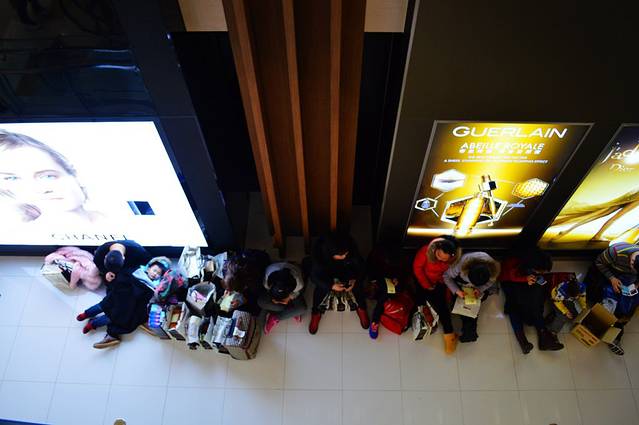 看看新罗免税店里看堆席地而坐的人们(商场没有休息区,一把椅子也找不到,也没有一个垃圾桶)。